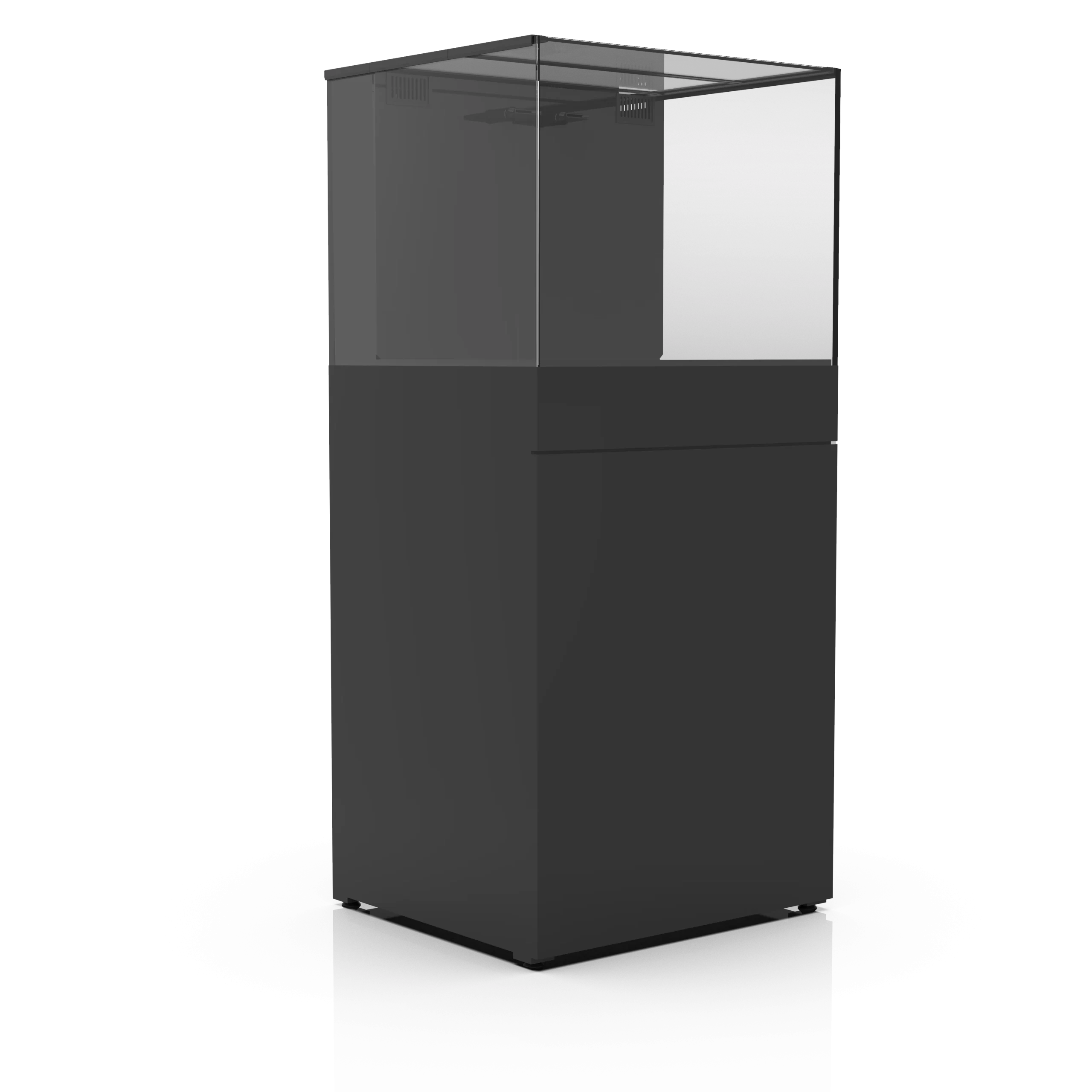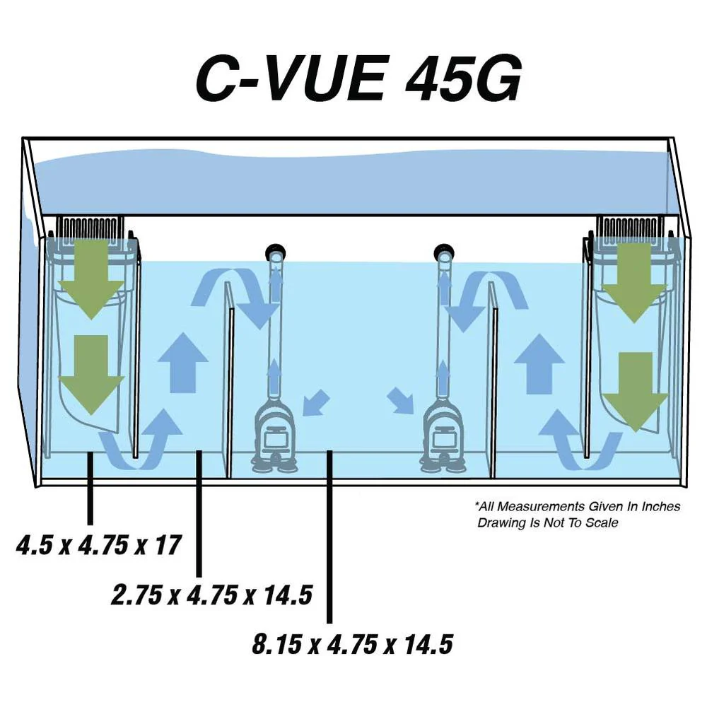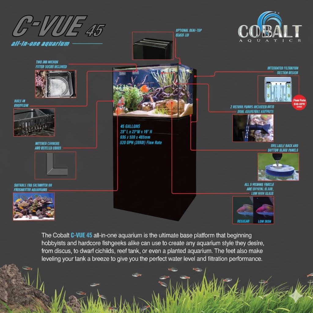Cobalt Aquatics' 45-gallon aquarium is the most advanced all-in-one aquarium on the market - The C-Vue series aquariums! C-Vue all-in-one aquariums are the ultimate base platform that beginning hobbyists and hardcore Fish Geeks alike can use to create any aquarium style they desire, from discus to dwarf cichlids, reef tanks, or even planted aquariums. Each aquarium features an integrated filter system, hidden behind a back wall, to keep bulky equipment out of sight. Included no-bypass 200 micron socks will keep the water crystal clear. Powerful pumps with up to 8 times the turnover and adjustable output nozzles ensure excellent circulation, bringing clean, filtered water to all areas of the tank. C-Vue aquariums also feature crystal clear, low-iron glass on the front and side panels, with beveled edges and mitered corners for an impressive, clean look and uninhibited viewing. For ultimate flexibility, the bottom and back panels are made from non-tempered glass that can be drilled to add bulkheads and plumbing, making the C-Vue aquarium series the most flexible all-in-one tanks on the market.